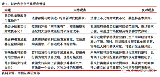 近期市场上也涌现了更多不同的声音,一些学者肯定适度财政货币化的效果。中国财政科学研究院院长刘尚希则发声认为在新的条件下,财政货币化具有合理性、可行性和有效性,以发行特别国债的方式实现赤字的货币化会比单一的货币政策更有效。面对前所未有的冲击和挑战,需要前所未有的政策来匹配,财政货币结合可以缓解当前财政的困难,也可以解决货币政策传导不畅的问题。他认为财政货币化最担心的就是恶性通胀的问题,但现在整个货币运行状态已经发生了质的改变,发生恶性通胀的可能性很小。
