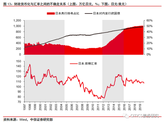 财政货币化最终如何作用于汇率,取决于财政和货币的力度。日本上世纪90年代末期到本世纪初期,财政力度的增幅很大,货币化的力度稍弱(QE力度较小),财政扩张的效应更强,在汇率上得到了表观体现——这个阶段的日元相对于美元是升值的。到了安倍政府的QQE时代,可以很清晰地看到财政虽然也在扩张,但力度已经远不及21世纪初。反观货币却开始大幅放松,政府债务大部分都被央行接手,体现货币放水的特征,日元汇率贬值。