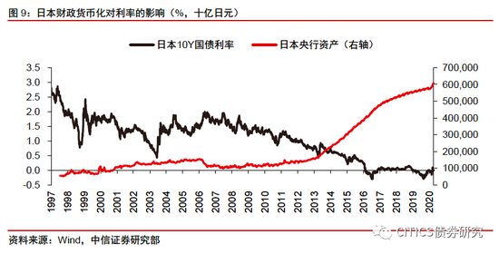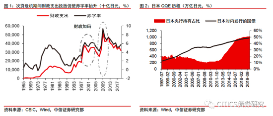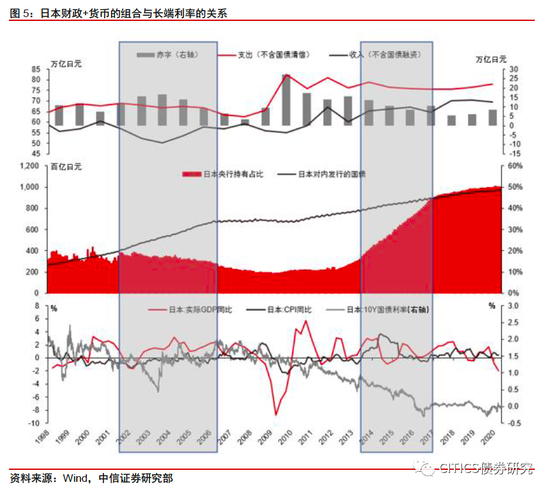 对于利率而言,财政和货币的作用是反向的。财政扩张是推升利率的原因,但货币扩张并配合财政,会带动利率下行,利率的走向还是取决于二者的力量对比。比如2001-2006年的大部分时间里,日本10年期国债收益率是小幅上行的;在QQE时期,一方面财政赤字收缩,央行又大规模购债,利率的快速下行也成为必然。因此,利率的走势是与货币和财政的组合方式相关的。