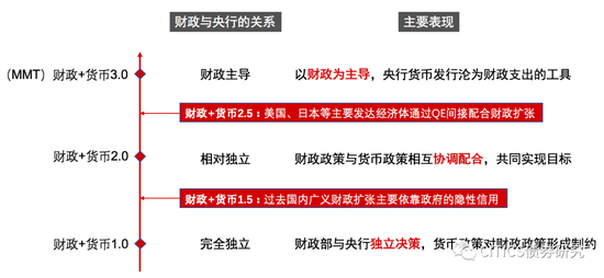 我们将财政政策与货币政策之间协调配合的程度划分为三个层次,第一个层次是财政与货币绝对独立,称之为“财政+货币1.0”;第二个层次为货币与财政相互配合,仍然独立决策,财政无法强制货币为其融资,但货币可以有选择地为财政提供支持,我们将其称之为“财政+货币2.0”;第三个层次即MMT,财政可以直接发行货币融资,称之为“财政+货币3.0”。
