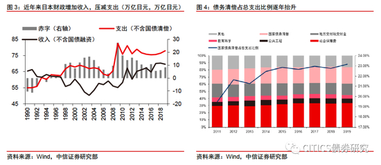 财政赤字收缩,加快债务清偿。此前受宽松的财政政策刺激和减税力度的加大,使得税收收入在总收入中的贡献逐渐缩水,国债发行对总收入的贡献至2009年达到49%的历史高位。安倍上任后推出“三支箭”政策组合,在保持财政支出相对稳定的同时加大税收,国债发行占比逐渐回落至正常区间。与之相对的,国债清偿在实施安倍经济学后稳步抬升,19年占总支出比已超过23%。一方面通过QQE和收益率曲线控制减轻财政融资压力,又同时收缩财政,体现了灵活稳健的财政与货币配合,显然不是财政货币化的思路。