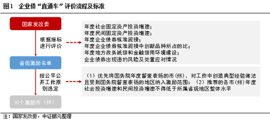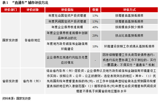 “直通车”制度内容及意义:(1)内容:每年年初,国家发改委根据评价指标,选定10个工作成效明显的省级作为激励支持地区,再由省级发改委根据相关办法,选择1个市(州)作为激励地区,将推荐材料正式报国家发改委,可以包含此前年度直通车市/州,国家发改委汇总确定最终名单。评价指标包含经济增长、区域融资规模、信用体系建设和风险控制等方面,具体分为六个指标,同时,设置“一票否决”,将企业债券风险防控及处置列于重要位置。(2)意义:企业债“直通车”制度,不同于“发改委对优质企业债的支持政策”,不是面向单个企业,而是从地区发展出发,覆盖域内所有企业,具有更广泛的意义。具体看,第一,提升当地企业债发行效率,及时把握市场发行机会。第二,通过六大指标设置,平衡经济增长与风险,同时引导企业创新,拓宽企业融资渠道。第三,通过名单制,提高各地积极性和工作效率,营造良好城市形象,吸引优质企业进驻。