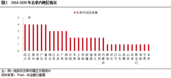 自2016年来,全国先后共有68地区被列入名单内[1],由于名单有效期为2年,截至2020年5月有18个城市在名单内,其中8个在2020年末到期。从城市特征看,第一,全国32个省份68个城市先后纳入名单,包括39地级市(州),29个县/区,以西南地区、华南地区和中部为主,西北、东北和华北地区较少。其中,包括12个省会城市,4个直辖市,2个经济特区所属地区。第二,部分城市多次纳入名单。宜昌分别于2016、2019和2020年纳入名单,安徽亳州、广东佛山、广州和深圳福田区、广西柳州、湖北宜昌、湖南长沙、江西南昌、四川成都、浙江舟山先后2次纳入名单,其他城市均为1次。第三,除了2016年纳入20个县/区外,其他年份纳入的县/区较少,且以区为主。
