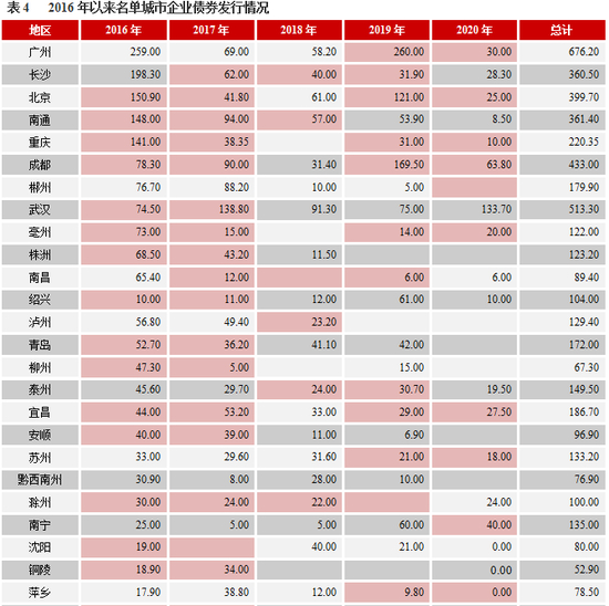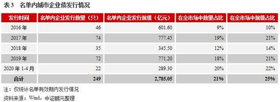 根据Wind数据,名单有效期内城市发行的企业债数量和规模在企业债发行总量的占比呈现上升趋势,2020年分别为20%和22%。