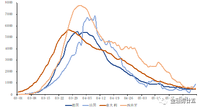 进入3月后,欧洲国家新冠肺炎确诊病例不断攀升,欧洲成为全球疫情的“震中”,其中以德国、法国、意大利和西班牙等欧元区国家的疫情最为严重。欧元区国家的疫情在4月上旬触顶,单日新增确诊病例数量呈现下降趋势,死亡病例增长放缓,疫情得到初步控制。目前来看德国、法国、意大利和西班牙的单日新增确诊病例数的7天移动平均值持续低于1000例,欧元区国家的疫情从爆发期已经进入缓和期,疫情防控取得初步效果。