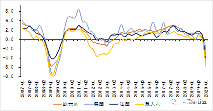 从GDP数据来看,欧元区2020年一季度GDP同比增速为-3.2%,环比折年率为-14.2%,经济增速创国际金融危机以来新低。欧元区主要经济体中,疫情较为严重的德国、法国和意大利一季度GDP同比增速分别为-1.9%、-5.2%和-5.6%。欧元区经济正在走向衰退的泥潭。IMF预计2020年欧元区经济增速为-7.5%,欧洲央行预计欧元区经济将萎缩5%-12%。