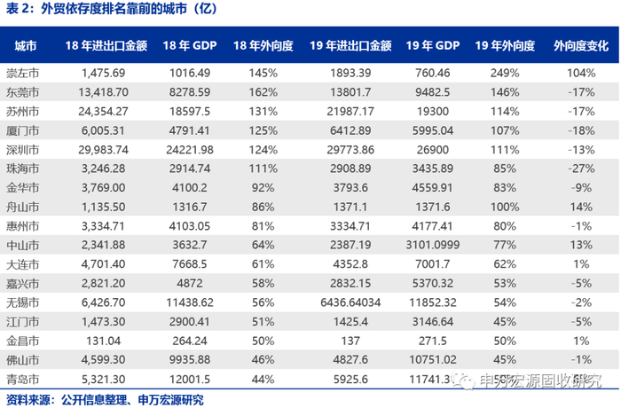 从各城市18、19年外贸依存度变化幅度看,除崇左市外其他排名靠前的城市均以下降为主,其中下降幅度较大的有珠海市、厦门市、东莞市等,上升幅度较大的有舟山市、中山市、天津市等。