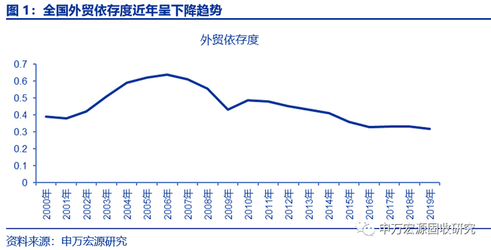 我们统计了2000年以来全国的总体外贸依存度及各个省份的情况,总体来看,我国外贸依存度是先上升后稳步下降的趋势,在2006年达到最高点为63.96%,2005-2007年这三年均在60%以上,2008-2009年这两年有一个相对较大幅度的下行,在2010年有所反弹后,近10年处于稳步下行趋势,近三年稳定在30%左右,2019年我国的外贸依存度为31.91%,与06年最高点相差30%以上。