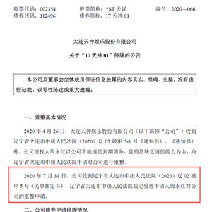 8月2日晚间,*ST天娱(002354.SZ)公告称,于7月31日收到《民事裁定书》,辽宁省大连市中级人民法院裁定受理申请人对公司的重整申请。