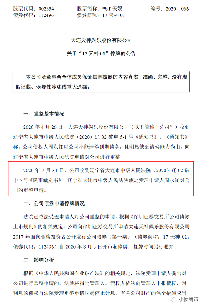 公告显示,因前期扩张过度,2018年以来*ST天娱受游戏、影视行业政策调整和市场环境变化等因素影响,陷入严重债务危机。“17天神01”自8月3日开市起停牌,复牌时间另行通知。