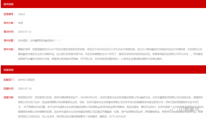 今年7月,有投资者将汝州温投违约事件投诉至平顶山市人民政府官网市长信箱,后汝州市人民政府回复称,目前汝州温投已向国通信托申请暂时延期,且其正通过开展融资、经营、资产变现等各项业务,积极筹措资金,争取早日归还国通信托到期本金。