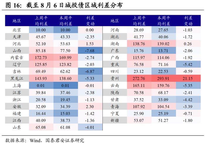 警惕弱资质区域利差走阔风险。从城投债区域利差对比看,贵州、内蒙古、云南、黑龙江等地区域利差偏高。从上周城投债区域利差变动来看,贵州上周利差走阔较多,山西、吉林、重庆上周利差收窄较多。