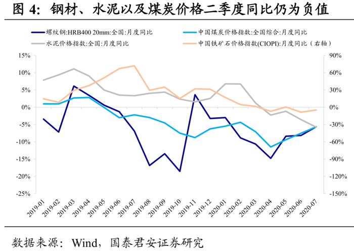 受价格下跌及出口下滑影响,产能过剩行业二季度表现不佳。从中报业绩预告看,二季度钢铁、采掘行业净利润同比分别下滑11%和39%,经营情况仍然低迷。4-6月水泥价格同比由正转负且持续下滑;螺纹钢、煤炭价格同比跌幅虽有收窄,但下跌幅度仍在10%左右,而上游铁矿石价格则维持震荡走势。产成品跌价幅度超过上游原材料,导致煤炭、钢铁、水泥等产能过剩行业毛利率同比下滑,二季度经营情况表现不佳。有色金属行业预告净利润同比由-90%上升至-75%,从售价看二季度有色金属价格同比得到修复,但铝、锌、铅等价格跌幅仍超10%,并且受海外疫情影响二季度有色金属出口下滑严重,同比跌幅超过20%。在价格下跌与出口锐减的双重冲击下,二季度有色金属行业信用基本面仍显低迷。但三季度以来随着需求修复,叠加海外疫情影响部分供给,产能过剩行业经营基本面正在加速好转。