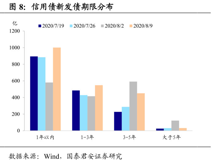 央行二季度货政报告确认货币政策拐点,上周信用收益率涨跌互现。8月6日,央行发布《2020年第二季度中国货币政策执行报告》,确认疫情防控取得重大成果以及二季度经济好于预期,货币政策回归常态。上周信用债市场收益率涨跌互现,1Y期限AAA、AA+、AA、AA-评级收益率分别下行2bp、2bp、5bp、9bp;3Y期限AAA、AA+评级收益率分别上行3bp、3bp,AA、AA-评级收益率分别下行1bp、5bp;5Y期限各评级收益率上行7-10bp。信用利差普遍收窄,信用期限利差全线走阔。