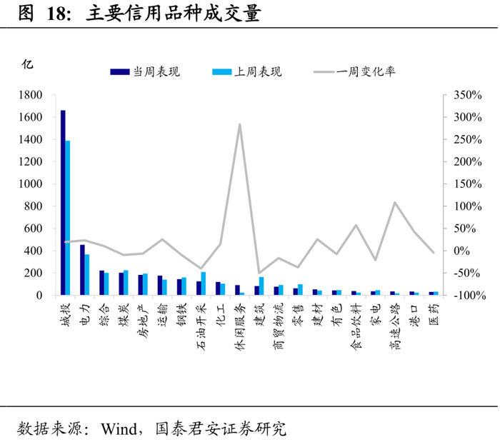城投债成交量上升。城投、电力、综合、煤炭、房地产成交量位居前5位,20个行业中,10个行业成交量环比上周上升。其中,城投债成交量上升规模最大,环比上升272.52亿。