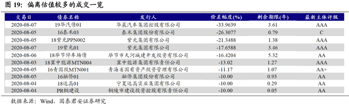 关注偏离估值较多的交易情况。上周共有10只债券成交价差幅度超过10%。其中,“19华汽债01” 成交价差幅度高达33.96%,该债券曾于2020年1月变更募集资金用途,发行人为华晨汽车集团控股有限公司。公司利润主要来源于华晨宝马,疫情下自主品牌乘用车产销量、业务收人继续下降,获利能力仍较弱;公司有息债务规模较大且逐年增长,债务主要集中于公司本部,且债务结构以短期为主;另外,公司于2020年5月出售子公司华晨中国3.96%股权给辽宁交投,持有华晨宝马股权略有减少。