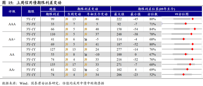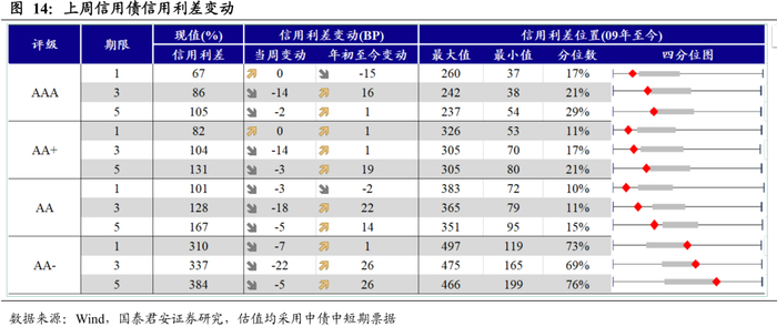 信用利差普遍收窄,信用期限利差全线走阔。1Y期限AAA、AA+评级信用利差基本保持不变,AA、AA-评级信用利差分别收窄3bp、7bp;3Y期限AAA、AA+、AA、AA-评级信用利差分别收窄14bp、14bp、18bp、22bp;5Y期限各评级信用利差收窄2-5bp。5Y-1Y期限AAA、AA+、AA、AA-评级信用期限利差分别走阔13bp、5bp、13bp、17bp;5Y-3Y期限AAA、AA+、AA、AA-评级期限利差分别走阔7bp、6bp、8bp、12bp; 3Y-1Y期限各评级信用期限利差走阔4-5bp。