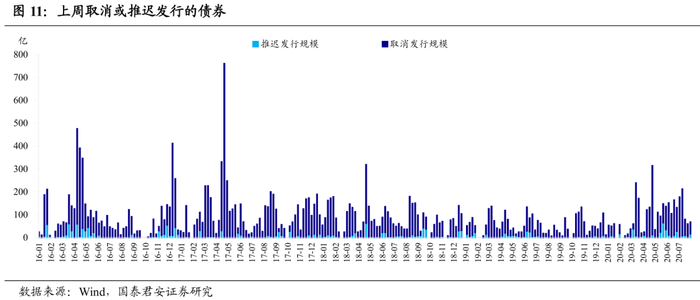 信用债取消或推迟发行规模上升。上周信用债取消发行7只,计划发行规模49.5亿,取消发行主体为6家地方国有企业、1家中央国有企业。上周信用债推迟发行2只,计划发行规模17亿,推迟发行主体为1家民营企业、1家地方国有企业。