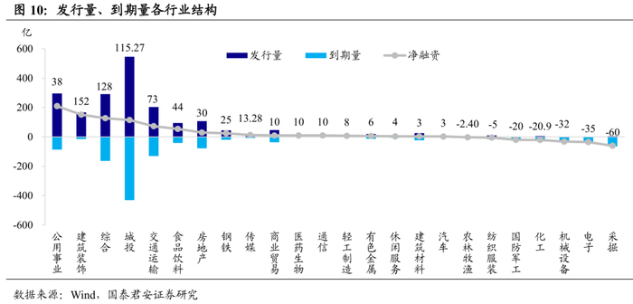 从产业债行业分布看,上周17个行业净融资额为正,其中公用事业、建筑装饰净融资额分别为209.87亿、151.85亿。7个行业净融资额为负,其中的采掘、电子净融资额分别为-60.11亿、-35.00亿。从边际变化看,公用事业增幅最大,而采掘降幅最大。