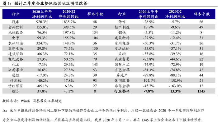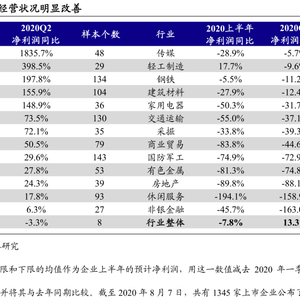 从A股中报业绩预告看,二季度企业整体经营状况明显改善。从行业整体情况看,复工复产下二季度企业生产经营基本恢复正常,净利润显著回升,企业现金流情况预计也将得到明显改善。1345家样本企业净利润同比由一季度的-35%上升至二季度的13%,净利润同比由负转正,净利润增速为正的行业也由一季度的8个上升至13个。分行业看,房地产行业二季度净利润同比为-88%,跌幅较上季度略有收窄但仍然显著下滑;钢铁、有色等产能过剩行业受产成品跌价及出口下滑等因素表现不佳,二季度净利润同比分别为-11%和-75%;汽车、食品饮料、机械设备等行业净利润增幅居前,同比增速分别达到1836%、398%、198%;商贸、休闲服务等板块客流量恢复低于预期,二季度净利润跌幅均在40%以上。