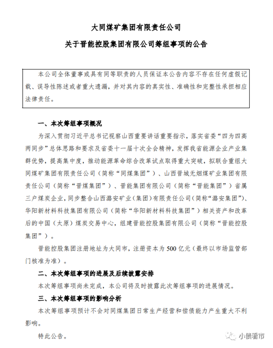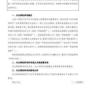 公告显示,为发挥山西省能源企业产业集群优势,提髙集中度,推动能源革命综合改革试点取得重大突破,拟联合重组同煤集团、山西晋城无烟煤矿业集团有限责任公司(下称“晋煤集团”)、晋能集团有限公司(下称“晋能集团”)省属三户煤炭企业,同步整合潞安集团、华阳新材料科技集团相关资产和改革后的中国(太原)煤炭交易中心,组建晋能控股集团。