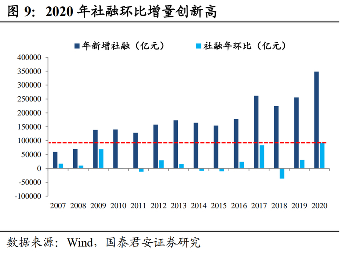 总量层面,2020年社融多增创历史最高,突破2017年高点。2020年全年新增社融34.86万亿元,较2020年多增9.19万亿元,高于“30万亿元”的目标,社融环比增量创历史新高,打破2017年环比多增8.4万亿元的记录。