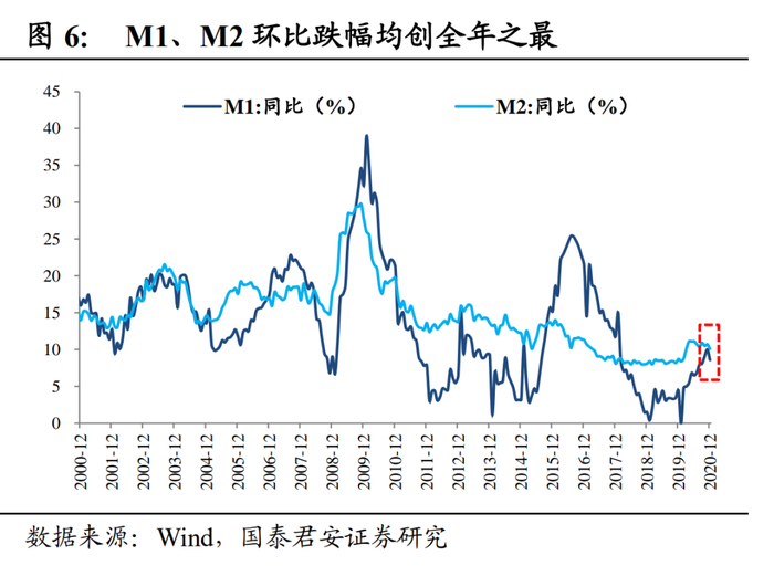 M1和M2环比跌幅均创全年之最,预示经济复苏动能出现回落。M1同比增速8.6%,环比回落1.4个百分点,为年内最大环比跌幅,预示经济增长动能可能已经出现下滑;M2同比增速10.1%,环比回落0.6个百分点,也创造年内最大环比跌幅,12月财政存款减少9540亿元,环比减少7683亿元拖累M2增速回落,财政年底集中花钱效应明显。
