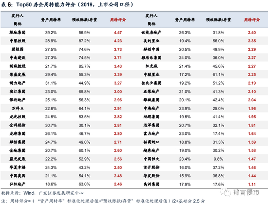 对周转率的衡量上,通用的指标为资产周转率,但考虑到房企营收的确认存在滞后性,本文引入“预收账款/存货”这一指标予以补充。具体算法为:先对房企的资产周转率与“预收账款/存货”指标进行标准化处理(减均值后除以标准差),再将标准化后两项指标取平均值后,按照0-5分布进行调整得到周转评分。从图表中可发现,绿地集团的周转评分最高,主要系2019年城际空间站等项目销售金额带来的大额回款增加。中梁控股、碧桂园、中南建设、新城控股等排名也较为靠前,这类房企均在三四线发力较多,其产品标准化程度更高,项目开发速度快;且部分强三线城市经济增长迅速,产品销售动力强,房企在去化环节也具备一定优势。