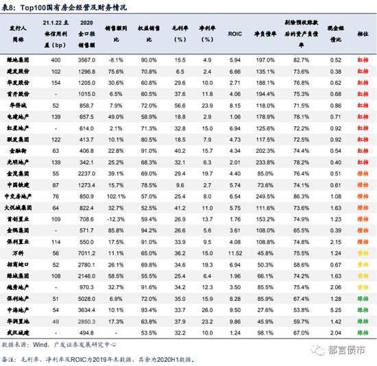 我们梳理了TOP100国有房企基本情况,从利差角度来看大体可以分为以下三类:(1)主体利差在80bp以下,基本没利差的主体,包括万科、保利、中海、中交、华润、招商蛇口、金茂、华侨城、大悦城、金融街。这类基本上是财务偏稳健的央企,通常作为投资者底仓配置。(2)主体利差在80-200bp的主体,包括绿城、铁建、首创置业、电建、建发、联发、光明地产、华发。这类主体由于有一定的利差,现阶段是机构从地产板块获取超额收益的重点主体。但这类房企财务状况有一定瑕疵,档位多为红橙档,经营效率在行业处于中下游,纯粹从经营基本面角度看比同等利差水平的民营房企整体要差。比如光明地产,公司是上海国企光明食品旗下地产子公司,2019年地产板块逆势夸张,有息负债大幅增长,但2020年突遇疫情以及“三道红线”政策,导致2020年上半年结转较少的同时,销售管理财务费用表并未出现同比例下滑,公司全年净利润大幅下滑,后续也面临较大降杠杆压力。这类主体后续面临的估值分化有很有可能会比较大,投资者需要从经营基本面出发精细化择券。(3)主体利差在200bp以上的主体,只有绿地控股一家。