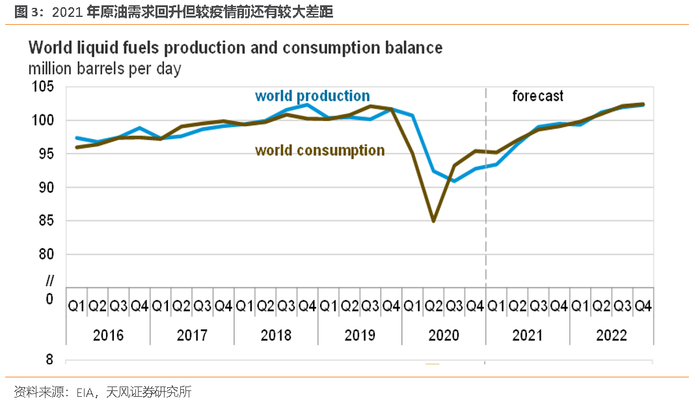 今年全球原油需求的回升较为明确,年内不会恢复到疫情前水平。根据EIA最新预测,预计2021年全球经济增长率5.8%,全球原油需求量反弹532万桶/日至9750万桶/日,较2019年的10119万桶/日还有较大差距。