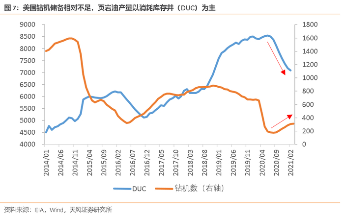 自去年二季度起,美国油井钻机数出现迅速下滑,8月中旬降至172部,创2005年以来历史新低;8月之后,美国钻机数开始企稳回升,但修复进度偏慢,截至3月19日仍较疫情前同比减少52.1%。钻机数量不足的背景下,目前美国页岩油产量主要通过库存井向完井的转换实现,库存井数量消耗明显。短期来看,库存井的消耗仍能支撑页岩油产量的回升,但后续页岩油产量的增量空间很大程度上取决于厂商的资本开支计划。
