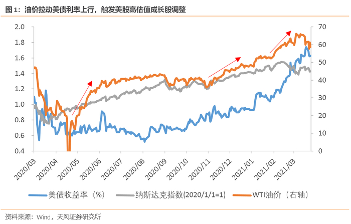 2020年4月以来,油价主要经历了三轮上涨。第一轮上涨出现在2020年5月,主要是供给推动,沙特与俄罗斯在2020年3月减产协议谈判破裂之后达成了新版减产协议,OPEC+同意5-7月每日减产970万桶,8-12月每日减产770万桶。第二轮上涨出现在2020年11月,主要受需求推动,2020年4季度起“疫苗接种-服务业复苏-原油需求恢复-油价上升”的逻辑开始逐渐兑现。第三轮上涨出现在今年2月,涨价原因再度切换回供给层面,极寒天气导致美国主要页岩油产地得克萨斯州产量大幅下降,OPEC借机延长减产、推高油价。油价是复苏交易的一环,油价的剧烈波动导致整个逻辑链的同向因素发生共振,美债利率受油价影响加速上行,并触发了美股高估值成长股的调整。