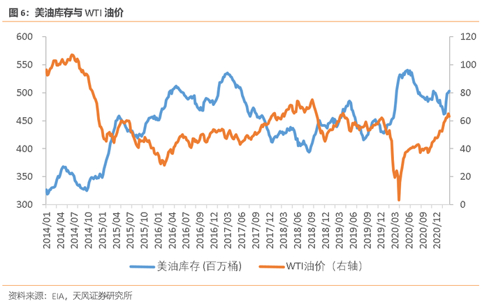 寒潮之前,美国中游炼化相比上游采掘恢复更快,美油库存快速去化,WTI油价底部回升;寒潮之后,炼化产业承受了更强的冲击,美油库存出现小幅反弹,最新一周环比增长191.2万桶,仍在反弹但斜率已逐渐走平。随着炼厂产能利用率的进一步修复,美油库存短期可能再度转为下滑;但年内美国页岩油产量的回升将拉动库存进入回补通道。