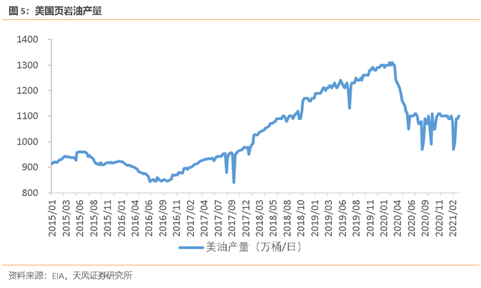 由于本次OPEC+的减产建立在美国页岩油产量迟迟无法恢复正常的基础上,短期油价的决定性因素不在于OPEC+的剩余产能,而在于美国页岩油的复产弹性。例如2月得州页岩油产量受寒潮影响出现明显下滑,3月OPEC+充分把握时机,在需求复苏的背景下延长了减产时限。因此今年美国页岩油产能的恢复弹性是决定油价走势核心的核心。目前来看,2月起油价的快速上涨(页岩油意外减产)和3月中旬至今油价的明显回落(页岩油产量回归)均与页岩油产量有关。年内油价的波动将很大程度上来源于页岩油产能恢复的不确定性。