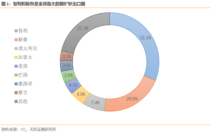 铜的供给在全球分布相对分散,南美洲是铜矿相对集中的区域。全球最大的铜矿砂出口国是智利和秘鲁,据ITC统计,2019年两国铜矿砂出口额占全球比重合计达到了51.7%。