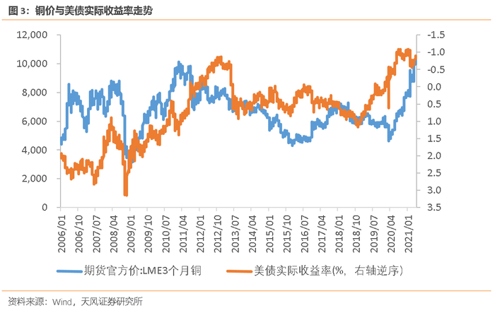 考察2007年以来铜价走势,美债实际利率、中国房屋施工面积增速与中美工业生产指标合计可以解释铜价变动的70%左右。