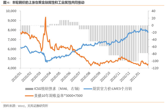 次贷危机后的铜牛是金融属性和工业属性共振的结果,本轮铜价的上涨同样受这两股力量推动。金融属性方面,为对冲疫情影响,2020年3月起美联储进行了新一轮大规模扩表,美债实际利率开始一路下行,为铜价上涨创造了良好环境。工业属性方面,2020年6月开始铜的供需两端出现了明显错配,全球精炼铜供需缺口不断扩大。