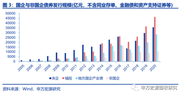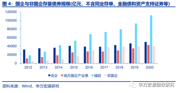 国有企业占发债主体的绝对多数。截止2020年底,有存续债券或2019年以来有债券发行的主体共5935个,其中国有企业4717个,占79.5%。国有企业发债主体中,央企主体有526家,地方国企4191家。2017年以来,央企和地方国企(含城投债和产业债)债券发行规模快速增长,三年平均复合增速均超过30%,2020年合计债券发行规模(不含资产支持证券)已超过11万亿,而非国有企业债券发行规模则保持在1万亿左右水平,三年平均复合增速仅4.5%。