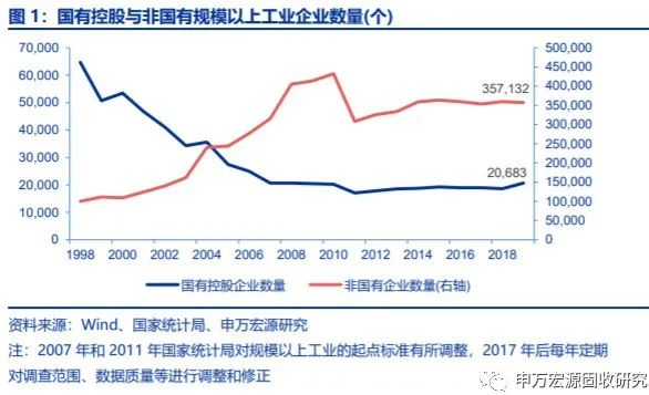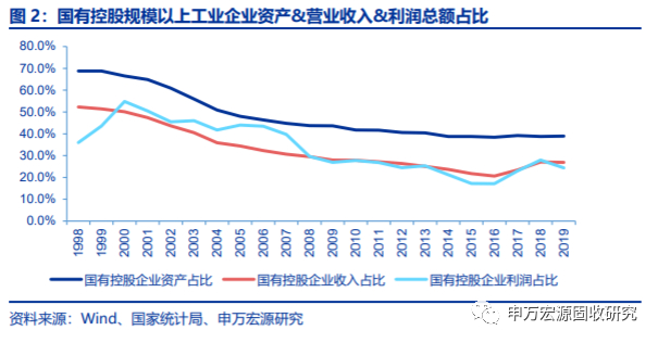 国有企业是我国国民经济中的重要组成部分。2019年规模以上工业企业中国有控股企业数量为20683个,而非国有企业数量则有约357132个。近20年,虽然国有控股企业数量由6万个以上下降至2万个左右,2019年国有控股企业数量占比仅为5.5%左右,但资产规模、营业收入和利润总额占比分别达到38.9%、27.0%和24.4%。