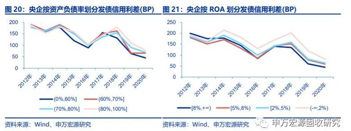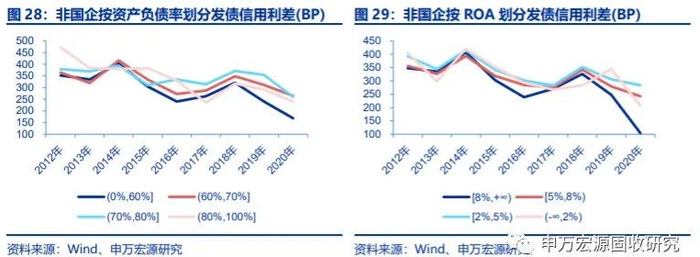 2018年以后高ROA非国企发债信用利差优势逐渐扩大。2018年以前,不同ROA水平的非国企发债信用利差相差不大,最大的时候是2016年,ROA在8%以上的主体发债信用利差比ROA在2%-5%之间的主体低63BP。2018年以后不同ROA水平的非国企发债信用利差走势显著分化,2020年ROA高于8%的发债信用利差比ROA在2%-5%的主体低180BP。ROA低于2%的非国企主体中非银金融企业较多,因此2018年以后发债信用利差走势与ROA高于2%的主体差异较大,并且2020年发债信用利差低于ROA在2%-8%之间的主体。