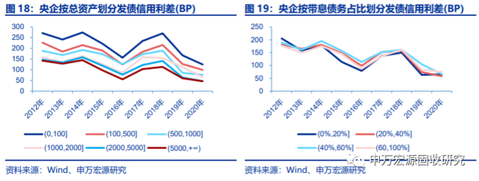 央企发债信用利差随主体规模上升而下降。由于央企总资产规模要显著高于其他属性的主体,因此我们将央企按总资产规模分为6档。不同资产规模央企历史上发债信用利差呈现3个特点:1. 总资产规模大的央企发债信用利差要小于规模小的央企,并且这个排序格局比较稳定;2. 相近资产规模档位之间的发债信用利差差距较小;3. 2012年以来,资产规模小于1000亿的央企主体发债信用利差降幅较大,而超过1000亿规模的央企主体发债信用利差降幅基本相当。