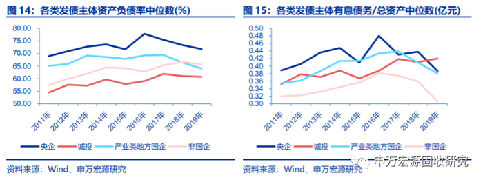 从规模角度看,央企一骑绝尘,非国企近几年增速较快。央企发行的债券券对应主体的总资产规模中位数2011年(FY,财报年,下同)便已超过1000亿元,2018年(FY)最高接近2500亿元。2019年(FY)央企债券对应主体的总资产中位数虽然下降至约1675亿元,但仍然是地方国企(含城投)的3-4倍,是非国企的近2倍。营业收入方面差距则更大,央企的营业收入中位数平均为地方国企(不含城投)和非国企的3-5倍。非国企的总资产和营业收入中位数2011年(FY)以来持续增长,截止2019年(FY)均仅次于央企。城投和产业类地方国企总资产规模较接近,但城投因业务特殊性,营业收入规模较小。