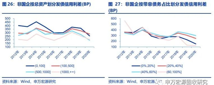 因为国企属性的影响,同样的财务指标条件下,国企发债信用利差的走势也与非国企有很大不同。一是资产规模的要求更高,即市场认为规模越大的国有企业资质越好,这一点在央企上体现得尤为突出,而地方国企在资产规模超过500亿之后,边际规模优势明显下降,非国企近几年规模优势反而在弱化。二是对负债水平的要求较宽松,带息债务占比和负债率的高低对央企和产业类地方国企影响不大,但对非国企影响则较明显。三是对盈利能力要求相对较宽松,历史上市场给予ROA高于2%的央企,ROA超过5%的产业类地方国企发债和ROA高于8%的非国企发债信用利差较明显的优势。2018年以来,不同ROA央企发债信用利差降幅相当;ROA高于8%和ROA在5%-8%之间的产业类地方国企发债信用利差降幅相当,ROA低于2%的企业发债信用利差降幅较小;而非国企中ROA超过8%的企业发债信用利差降幅要明显大于ROA低于8%的企业。