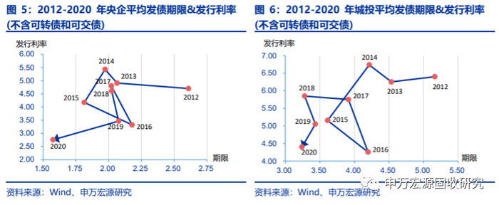 央企发债利率显著低于其他主体。从平均发行利率角度看,2012年以来央企平均发行利率仅3.93%,城投为5.20%,产业类地方国企为4.93%,而非国企为6.01%。各主体属性比较来看,央企、产业类地方国企和城投的平均发债期限和发行利率基本基本呈由小到大排列,而非国企发行利率一直最高,发行期限虽然大致与产业类地方国企相当,但波动最小。