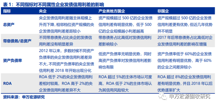 对比总资产规模、带息债务占总资产比例、资产负债率和ROA四项指标对不同属性发债信用利差的影响,在同样指标条件下,央企比非国企平均低100-200BP,产业类地方国企发债信用利差比非国企平均低50-100BP。