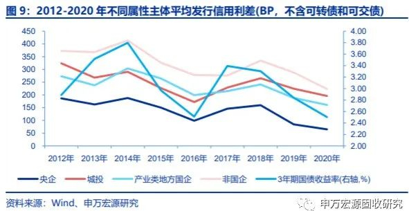 与2012年相比,非国企债券发行信用利差降幅最大,产业类地方国企降幅最小。我们以中债国债平均收益率为基准,用线性插值法计算不同年份对应期限的各属性主体的信用利差,并取当年平均值。2012年以来,各属性主体平均发行信用利差整体呈下降趋势,2020年非国企发行信用利差较2012年下降约150BP,降幅最大;央企和城投发行信用利差分别下行约122BP和128BP;产业类地方国企发行信用利差下行约113BP,降幅最小。