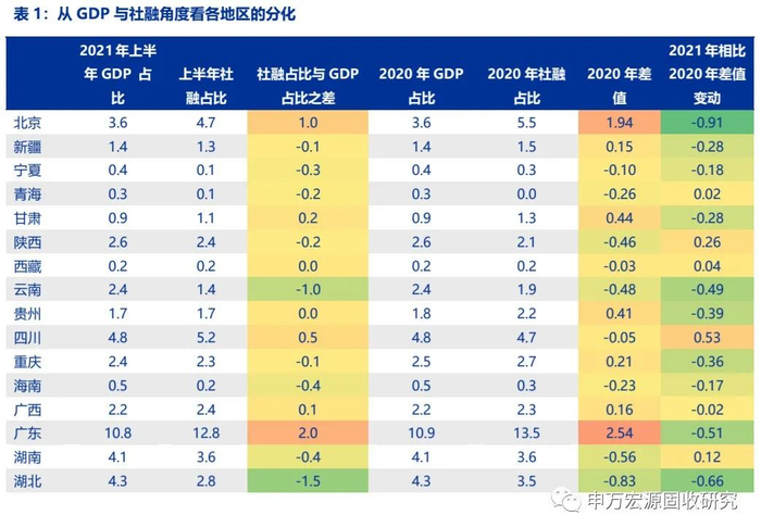 比较各省市GDP占比与社融占比,2021年上半年社融占比明显高于GDP占比的是浙江、江苏、北京等地;2021年上半年二者之差为正,且今年上半年二者之差相比2020年有所改善的是浙江、江苏、山东、江西、四川、西藏。2021年上半年二者之差为负,且今年上半年二者之差相比2020年降低的是:山西、河北、天津、湖北、河南等地。
