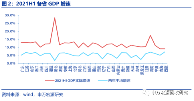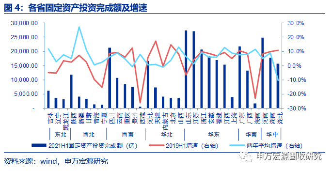 固定资产投资方面,共14个省份两年平均增速高于2019H1,其中8个分布在东北、西北地区;西南、华北、华东、华南、华中等地增速普遍回落。