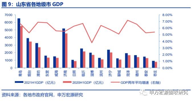 各地市总量排名未发生变化,总体维持高增长。上半年,山东省各地市GDP总量排名未变,青岛、济南依旧以6539、5199亿元的总量位居前列,两年平均增长6.7%、5.5%。菏泽市增速最高为7.2%,淄博市最低为3.8%,大部分地市增速在5%以上,总体保持高增长。