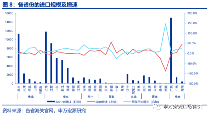 大部分省份进口增速有所提升,新疆、宁夏、青海等西北地区增速略有回落。从进口来看,上半年23个省份进口增速有所提升,西藏进口11.05亿元,两年平均增长1.47倍,主要系2019H1年药品进口大幅较少,2021H1高新技术类产品进口增长5.6倍;新疆、宁夏、青海等西北地区进口增速略有回落。